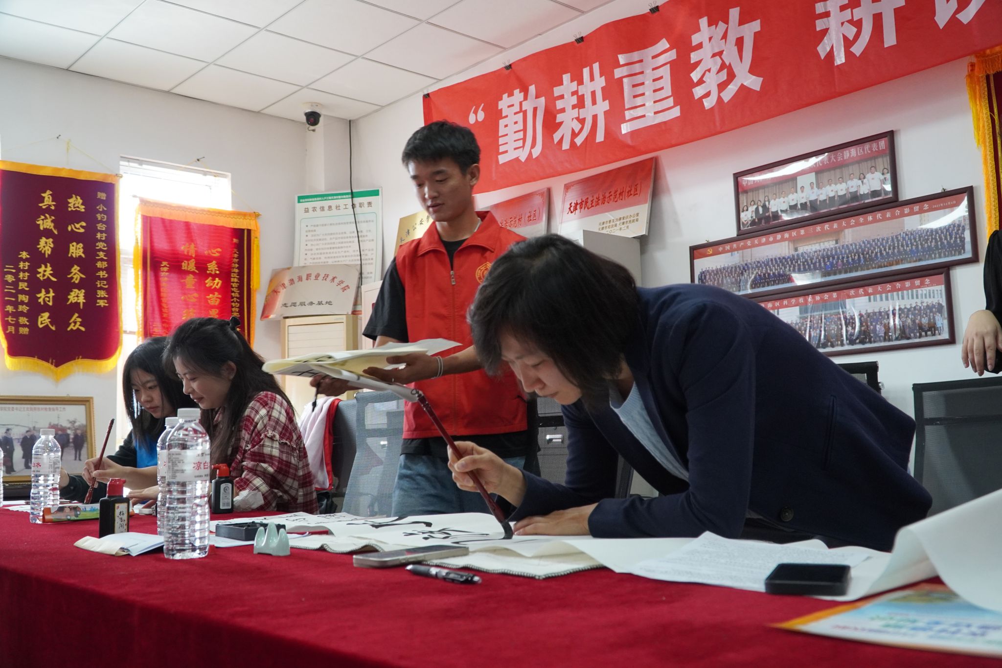 在书法交流环节,兰亭社志愿者提前准备好齐笔墨纸砚,师生与村民围坐在一起,共同研练书法技艺。大家挥毫泼墨,“民族团结”“乡村振兴”“同心共筑”等字样在宣纸上缓缓展开,笔墨流转间传递着对美好未来的共同愿景,也让中华优秀传统文化在互动中焕发出新的活力。