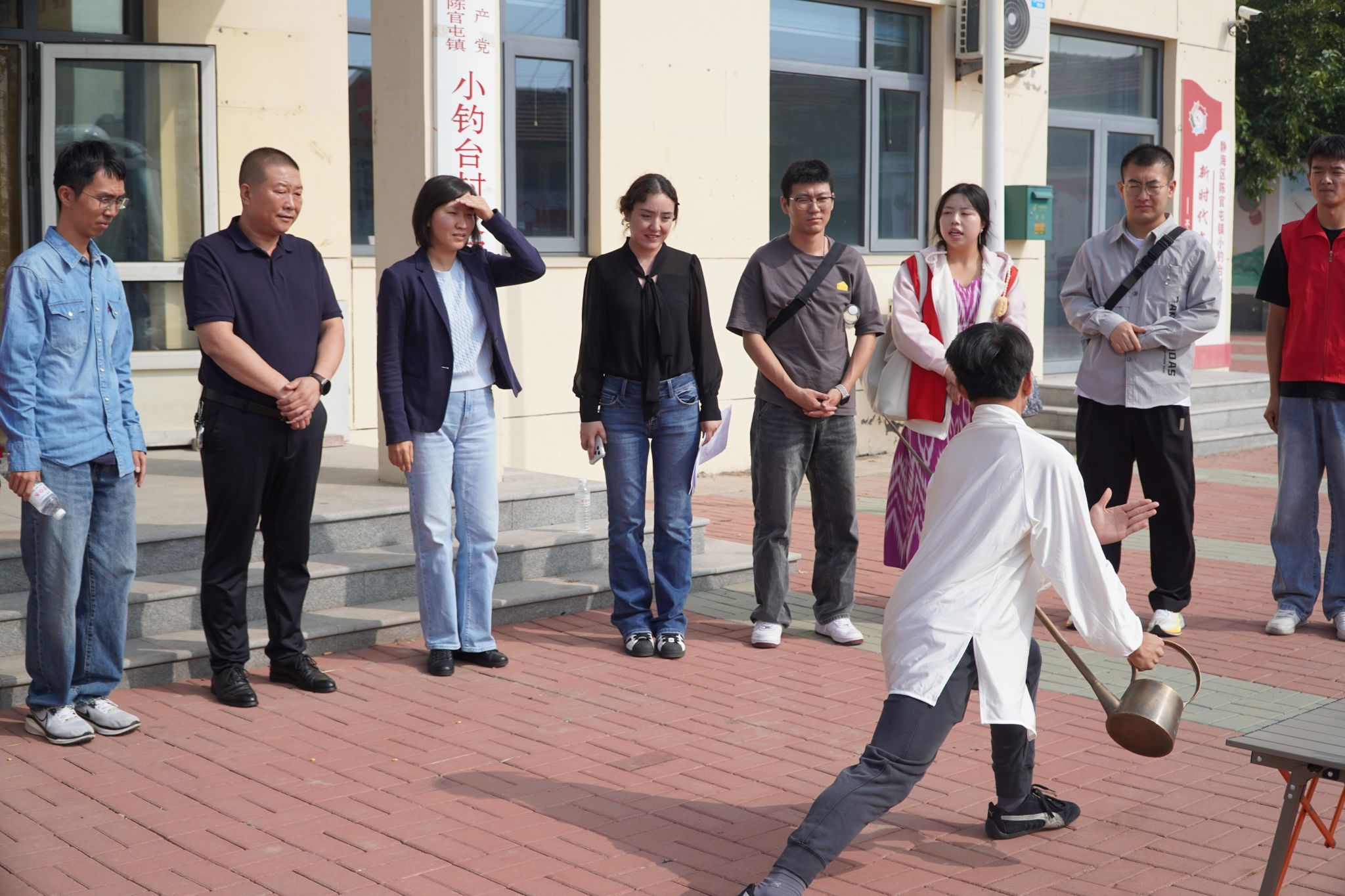 舞蹈表演结束后,刘御龙同学带来精彩的长嘴壶表演与茶艺展示。烫壶、置茶、注水、奉茶,每一个动作雅致规范,滚烫的热水在茶具间灵活流转,清雅的茶香渐渐在广场弥漫。最后,他将泡好的热茶逐一递到村民手中,村民们喝下热茶,暖意直达心底。大家在茶香与欢笑中,感受到了中华传统茶艺文化的宁静韵味,“民族团结一家亲”的种子也在互动中悄然生根。