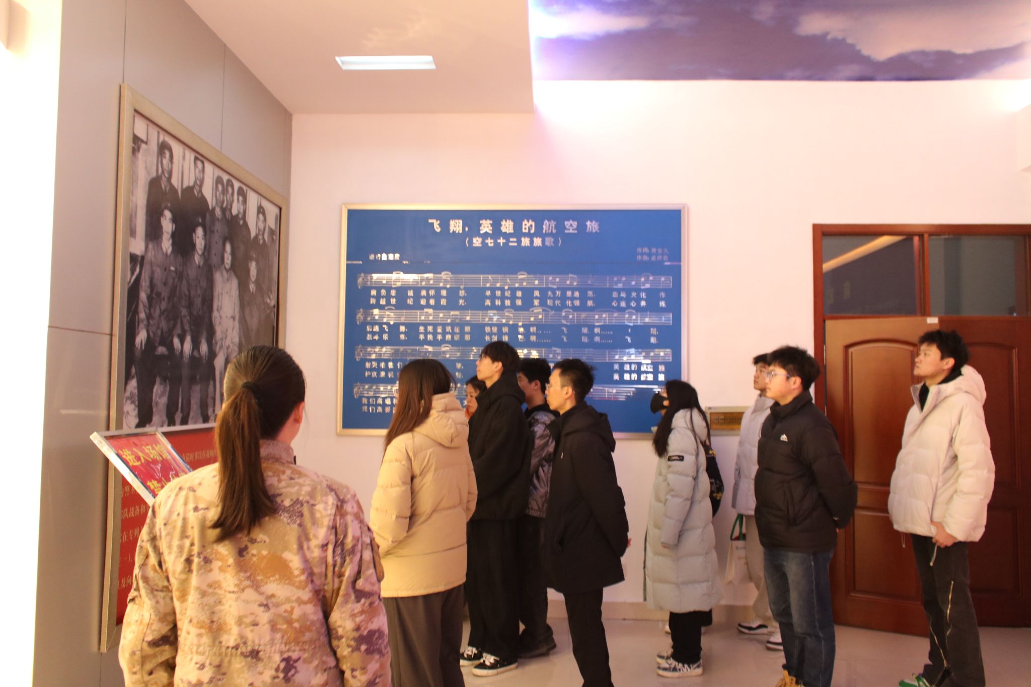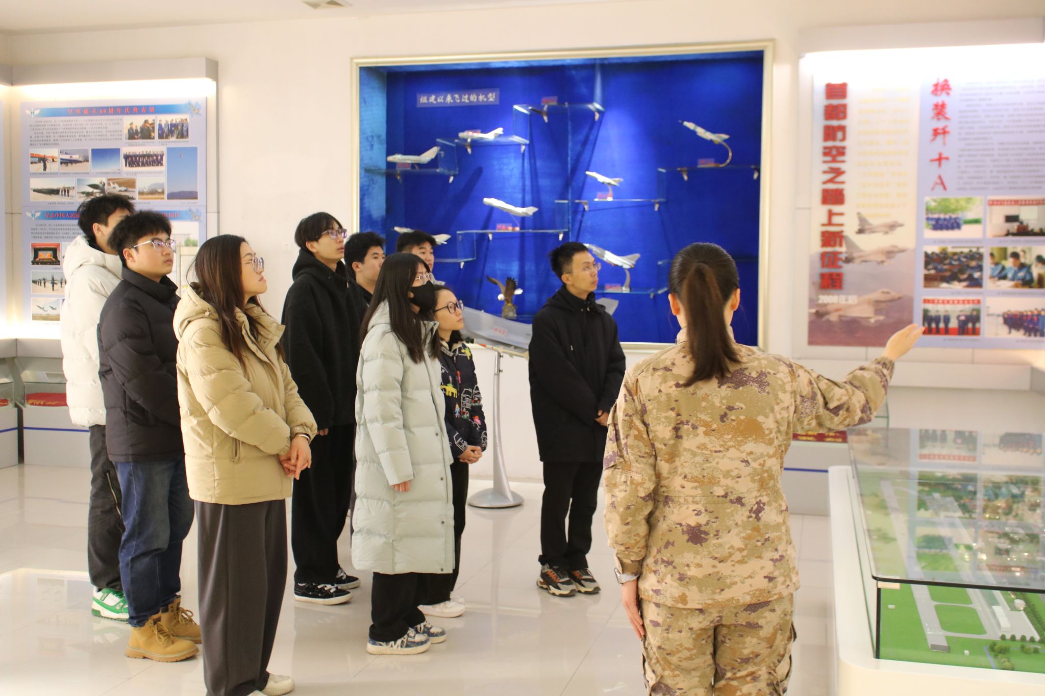 在部队官兵的热情引导与细致讲解下,学生代表们有序参观了歼10-C等阅兵表演飞机、先进战斗机,以及部队旅史馆。官兵们围绕装备的气动布局、航电系统等核心性能参数,结合装备的研发历程、实战应用与阅兵保障的光辉事迹展开讲解,让同学们对我国航空军事力量的发展有了全方位、立体化的直观认识。驻足在一架架战机前,机翼上闪耀的军徽、机身精湛的工艺,深深震撼了在场的每一位学生。