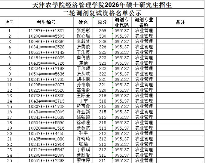 天津农学院经济管理学院2026年硕士研究生招生二轮调剂复试资格名单公示